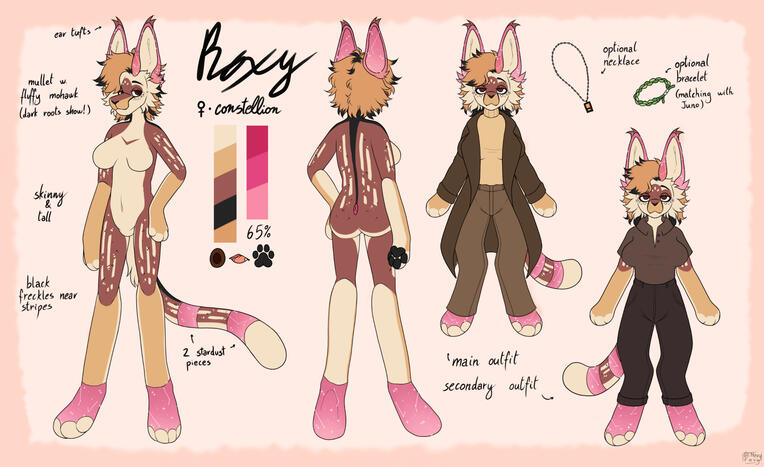 ref sheets will always include a front and back view (anthro) OR side views (feral), chibi with clothes/accessories(anthro or feral), and color pallette. More can be added , just like in customs